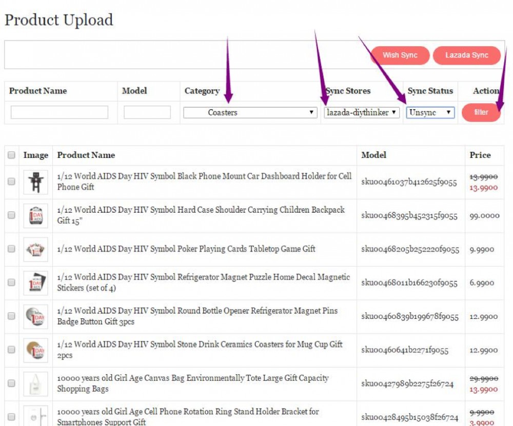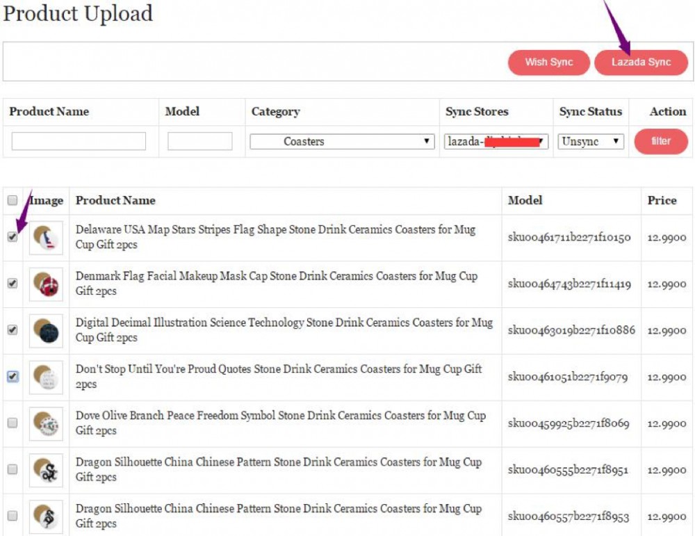2.筛选产品,选择店铺,在 Category 处选择需要上产的产品分类,在 Sync Stores 处选择您要上传产品的店铺,Sync Status 选择 Unsync,全部选择完成后点击 filter (注意:一定要选择 Sync Stores 和 Sync Status 并且点击 filter,否则无法确定同 步的店铺)